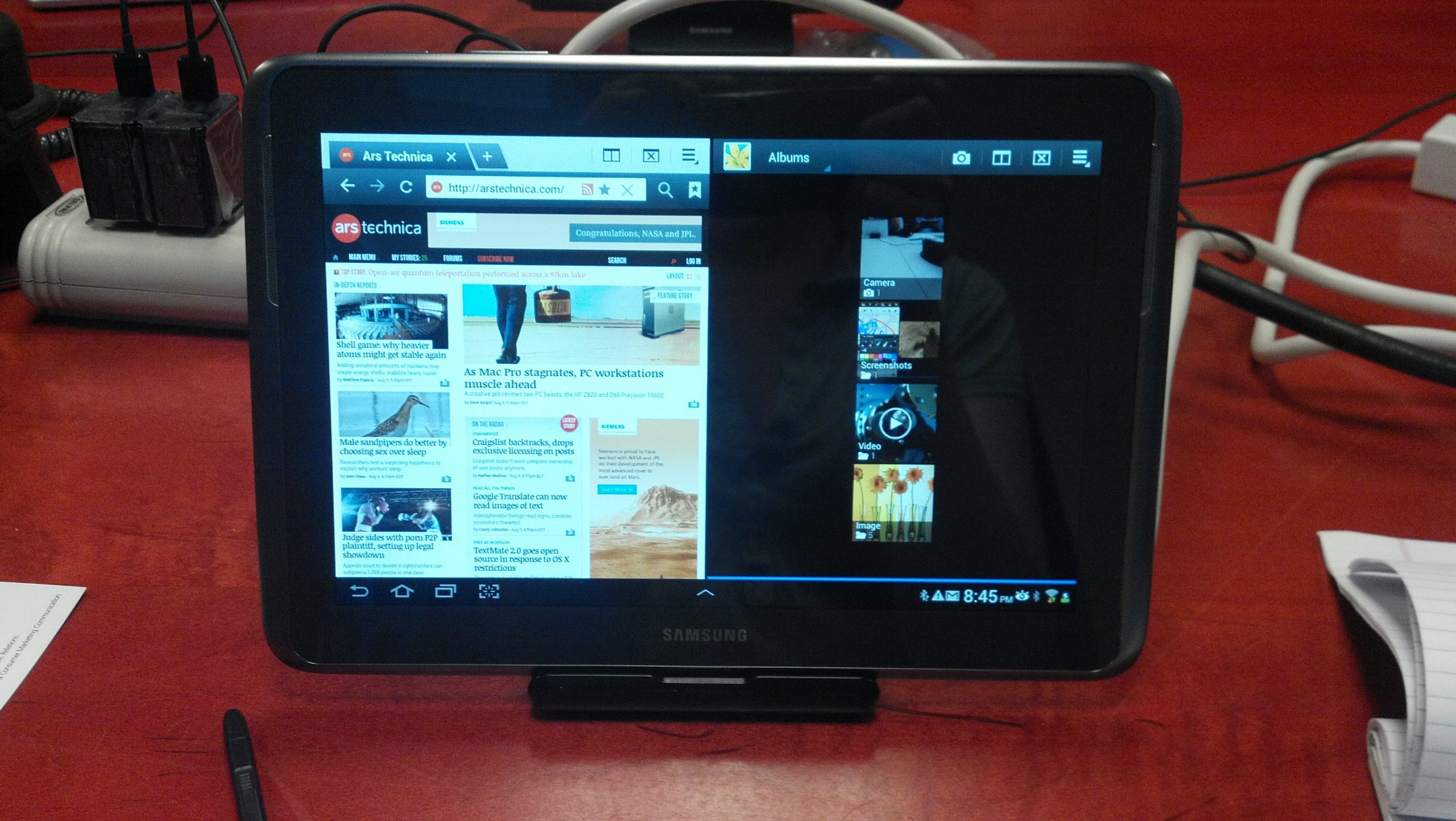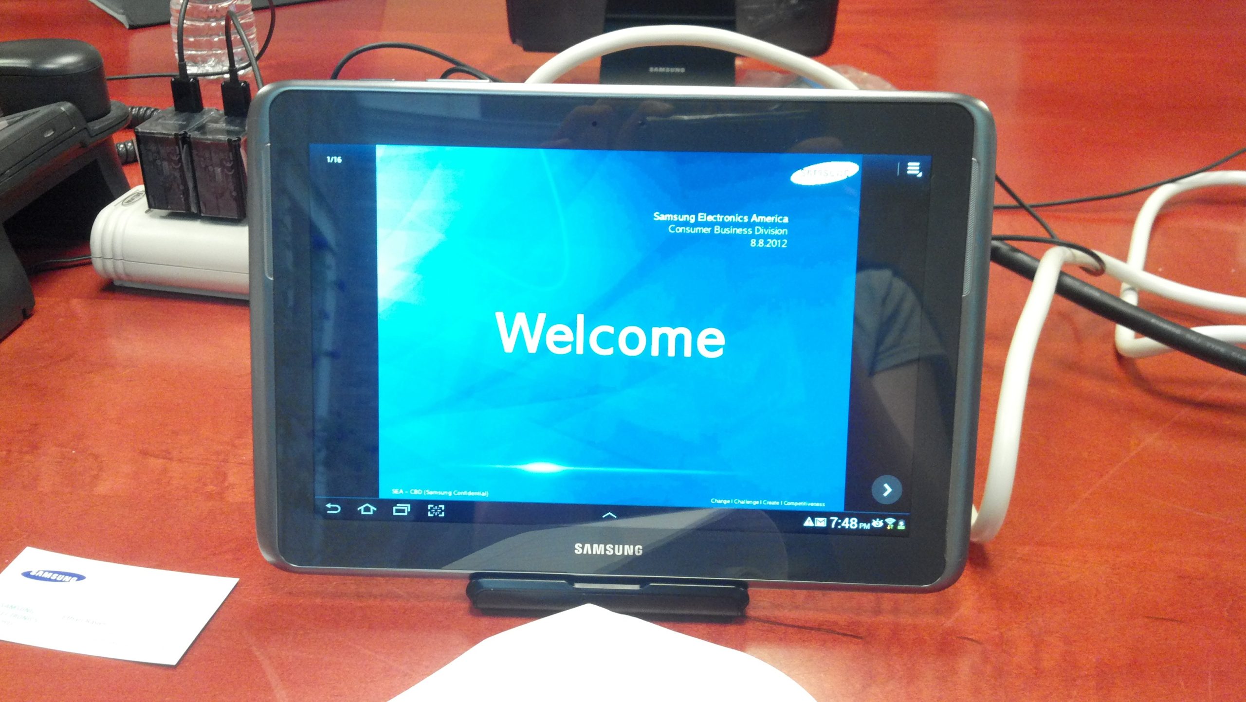 The display screen is WGXA with a 1280×800 resolution. The tablet I handled looked OK, but it wasn’t the sharpest-looking display I’ve ever seen. I largely used the tablet propped up on the desk dock that Samsung had provided (sold as a separate accessory), but when I picked it up it seemed solid and didn’t suffer from the Samsung Galaxy S III’s cheap plastic feeling. Samsung’s presentation was given using an HDMI dongle (sold separately) that mirrored everything from a Note 10.1 to a large TV screen.