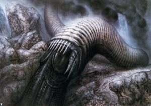 However, directly because of the failed project, Giger was hired a few years later by Ridley Scott to work on Alien, a film that involved a number of other Dune alums, including scriptwriter Dan O’Bannon. Alien was already in heavy preproduction and featured art by the likes of Ron Cobb, Chris Foss, and Moebius (Jean Giraud)—Foss and Moebius had contributed significantly to Dune as well. Giger was brought on by Scott after O’Bannon introduced the director to Giger’s work, and Giger’s designs displaced all other preproduction art for the titular monster.