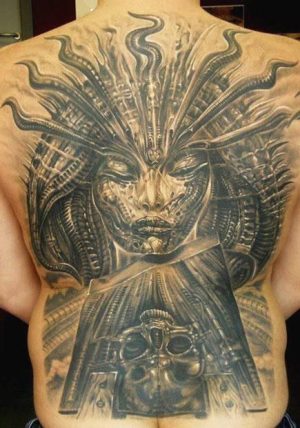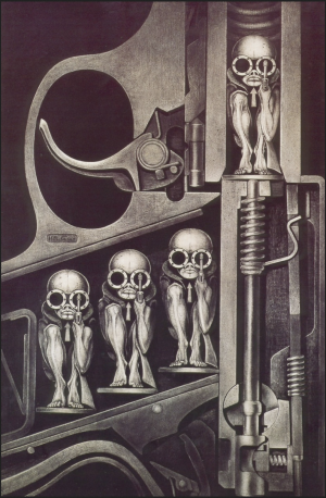 Giger reportedly did not enjoy most of the work he did on movies—he was first and foremost a painter and a sculptor, and he found working under deadline for movie production studios frustrating and unsatisfying. He described his work as “biomechanical”—most typically monochromatic, disquieting sets of images that blended the living and the mechanical together, often with sexual or fetishistic overtones. He developed this trademark style during the mid-1960s while studying design at the School of Commercial Art in Zurich, first working in oils on canvas. Later, he moved on to working freehand with an airbrush—the style of painting with which he is most solidly identified.