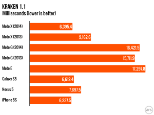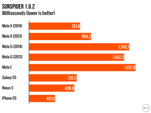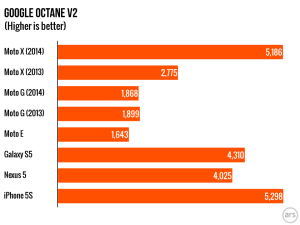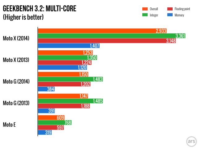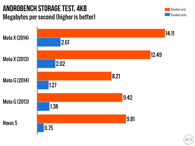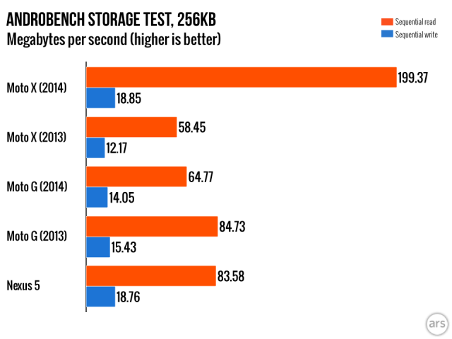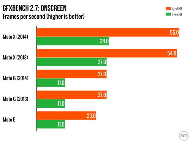 There are a few other changes to the new version of the Moto G, but the bigger screen (and the corresponding larger body) is the only one that’s really worth mentioning. Everything else about the display panel is the same as it was back in December—using the same 720p resolution in a larger display leads to a somewhat lower pixel density (294 PPI, compared to 329 PPI in the original), but it’s not so much lower that you really notice when you’re reading e-books or viewing images or browsing the Internet. The screen even retains the same vaguely purplish cast, a less-than-perfect aspect of the panel that you don’t really notice as much in isolation, but you definitely see when the Moto G is sitting next to a Nexus 5 or a Moto X.