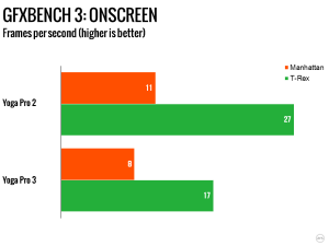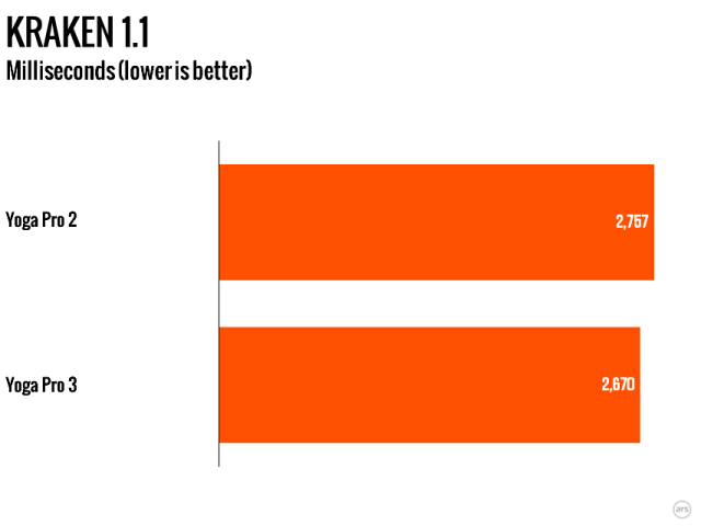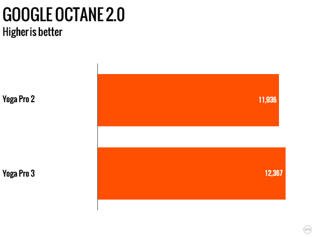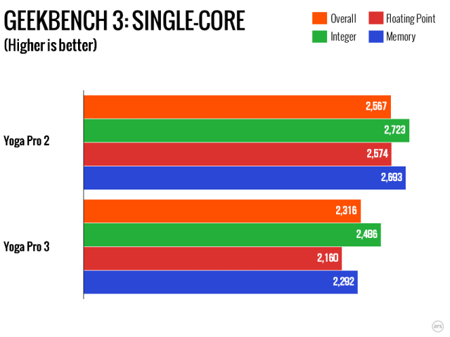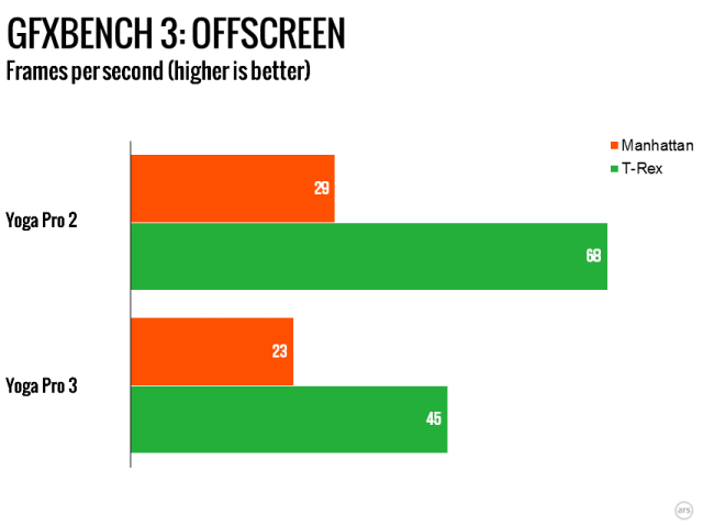 As nifty as the new hinge is, the processor is in many ways the point of this refresh. The previous Yogas used U-series processors. These are Intel’s Ultrabook-oriented parts, with a 15W TDP. The new Broadwell processor, however, is a Y-series part. Y-series processors are ultra low power; the chip in the Yoga Pro 3 has just a 4.5W TDP. This has implications for the clock speed of processor. While both the Haswell Core i5-4200U and Broadwell Core M-5Y70 notionally have a 2.6GHz maximum clock frequency, the Haswell part has a base frequency of 1.6GHz, compared to just 1.1GHz for the Broadwell.