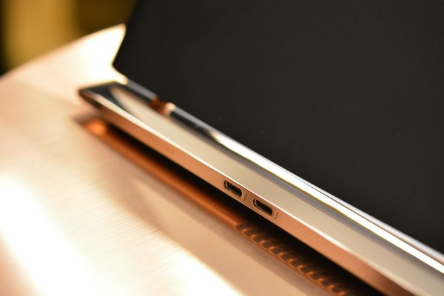 There’s not a lot of real estate for an array of ports on the Spectre either, but HP managed to put three USB Type-C ports on the back of the copper-coated edge just behind the notebook’s hinge. Two of those ports are Thunderbolt as well, and they all support display, charging, power, and data. You can charge the notebook, hook it up to external displays, and share data using any and every one of the ports.
