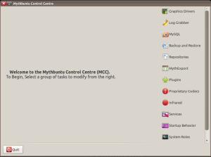 Mythbuntu’s control center lets users configure the system. Options include installing different desktops, configuring MySQL, installing proprietary drivers and codecs, and setting up remote controls.