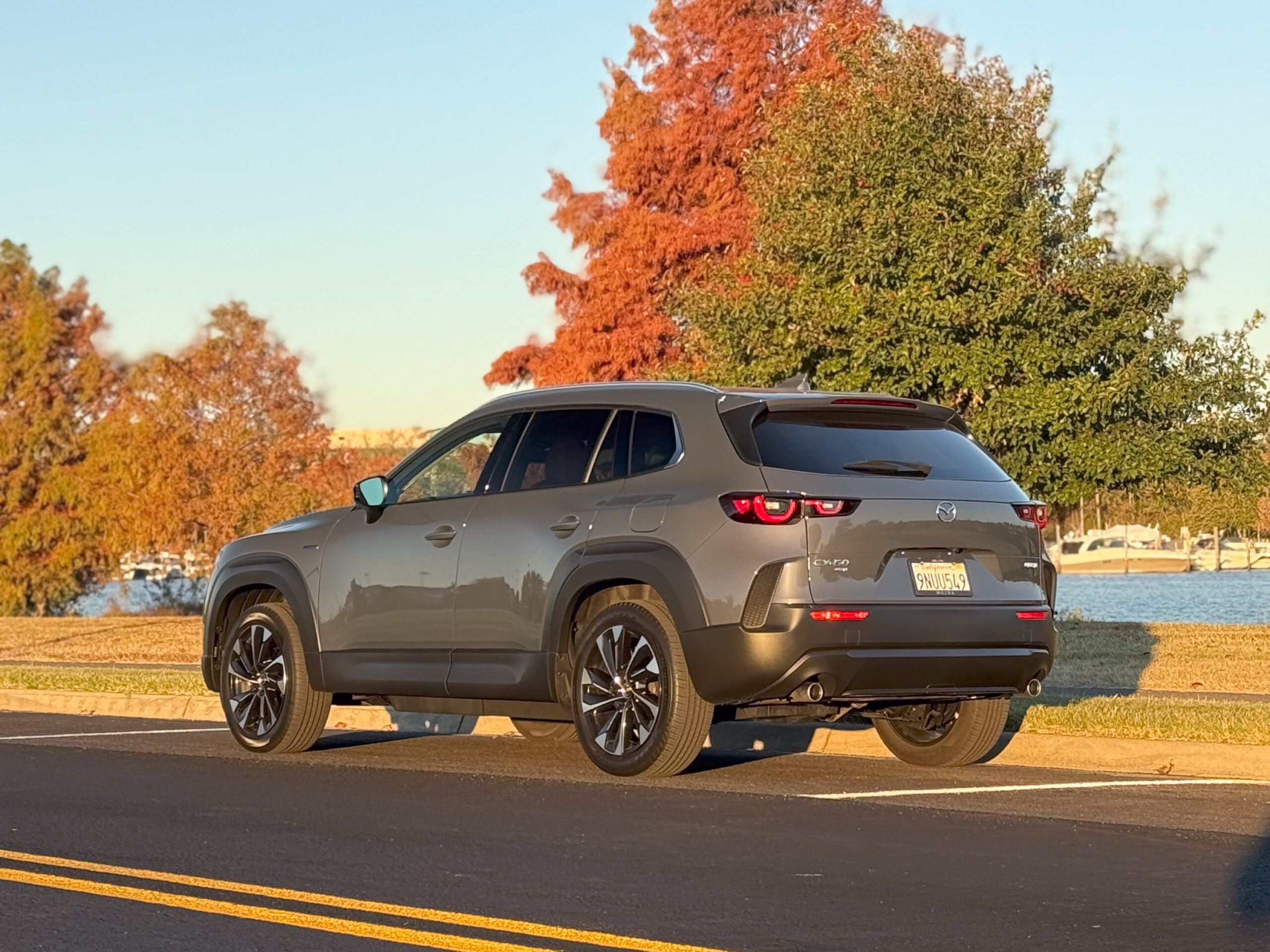 Open the hood, and instead of one of Mazda’s Skyactiv engines, you find one of Toyota’s 2.5 L naturally aspirated Atkinson cycle engines, which drives the front wheels together with two electric motors (one is really the integrated starter motor) via a continuously variable transmission. At the rear, a third electric motor powers the rear wheels when necessary. The front traction motor provides 118 hp (88 kW), the rear motor can add an extra 54 hp (40 kW), and total output is rated at 219 hp (163 kW) and 163 ft-lb (220 Nm).