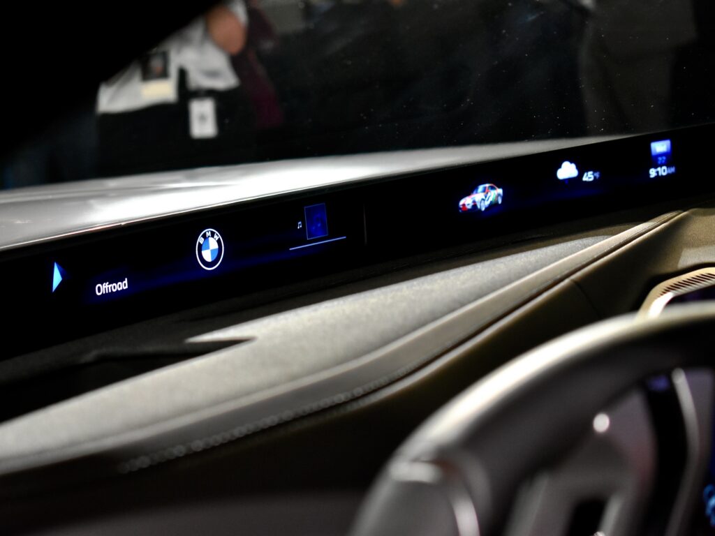 The Panoramic iDrive Display that debuted in the Neue Klasse EVs makes an appearance here as well. The door-to-door screen is mounted high to keep it in the driver’s line of sight, with a gauge cluster on one side and secondary widgets (you can even display photos of old BMW Art Cars if you like) to the right. It’s accompanied by a 17.9-inch central touchscreen and 14.6-inch front-passenger touchscreen below. You can use the screens to open and close the available automatic doors, which have integrated servos and dedicated radars to ensure reliable operation. Flush handles on the outside open the doors with only a touch.