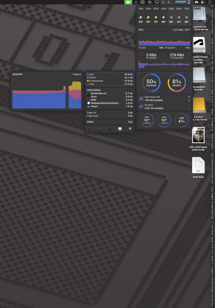 This is on my M1 Ultra Studio with 64GB RAM. Still waiting for the 280 applications to finish launching. To Apple's credit - they are STILL Launching. Even on a 2160 vertical screen the dock icons are barely visible.