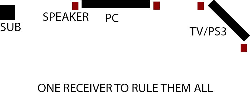 Let's say you have a computer against the wall and a TV in the corner. Let's also say you want to have 2.1 sound for the PC and for the TV.