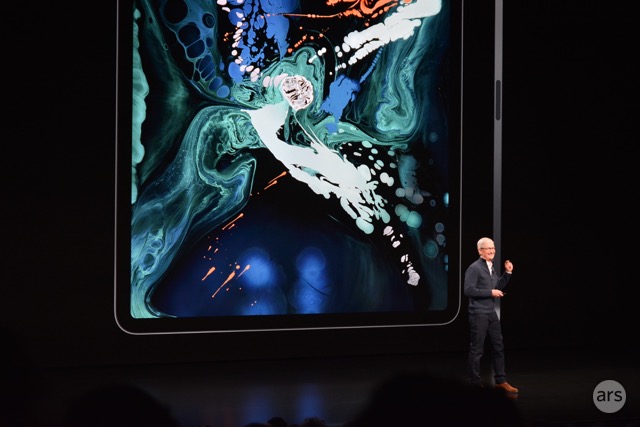 The renders previously floating around the Internet accurately detailed the new iPad Pro design. The new models, coming in at 11″ and 12.9″, have slimmer bezels on all four sides of their displays. While the bezels aren’t as small as those on the iPhone XS and XS Max, they’re much thinner than we’ve seen on an iPad before. (In his event liveblog, Ars’ Samuel Axon noted the new iPads are virtually the size of a standard 8.5″ × 11″ piece of paper, and they resemble the iPhone SE.)