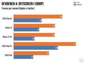 In our tests, we found that the iPad Air generally delivered CPU and GPU performance quite similar to what we saw in the iPhones as expected, though we saw some better graphics results—nice to see on a device with this larger, higher-pixel-count screen.