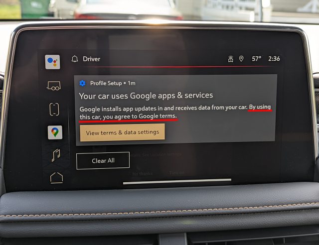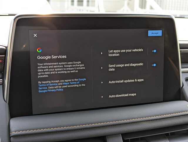 Let’s get the usual disclaimer out of the way: This article is not about Android Auto, Google’s tethered phone app and competitor to Apple’s CarPlay. Android Automotive, fully spelled out (it’s sometimes branded as “Google Built-In”), means the car is one big Android device. A computer runs the car’s infotainment system, and that computer runs Android. Even if you have an iPhone in your pocket, that won’t change the OS your car runs (it does support CarPlay, though). For most models, buying General Motors will mean buying an Android Car. You’ll see an on-screen message pop up during setup saying, “By using this car, you agree to Google’s terms of service.”
