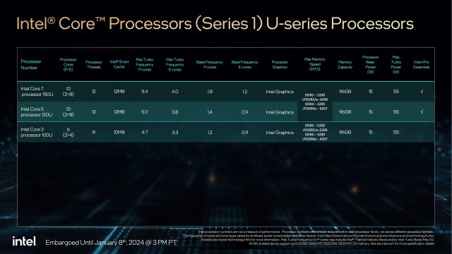 But what’s frustrating is that the new Series 1 Core 7, Core 5, and Core 3 chips are also based on a clock speed bump of Raptor Lake, rather than the all-new Meteor Lake architecture used in the Core Ultra CPUs Intel announced a month ago. The Core 7 150U, Core 5 120U, and Core 3 100U share all of the same key specs with last year’s 13th-generation U-series processors, including CPU core count (two P-cores and either 4 or 8 E-cores, depending on the chip), RAM support, GPU, and power use. They also lack new Meteor Lake features like an onboard NPU and Intel Arc graphics.