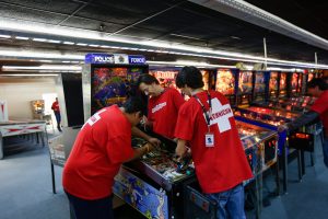 Some of the many pinball techs try to get a Police Force back up and running.