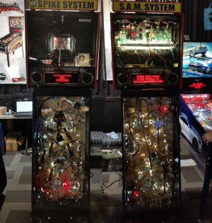 Stern’s new Walking Dead game, shown on the original S.A.M. platform (right) and the brand new SPIKE platform (left) which uses modular boards to reduce the amount of wiring required.