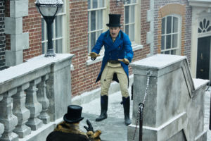 Sword swallowers, a circus elephant, and cheeky, pickpocketing kids who could easily be the distant cousins of Oliver Twist all entertain the time-travelling duo as they amble along the frozen River Thames and gawp at the last great frost fair.