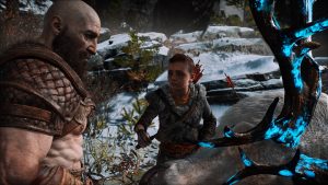 At the beginning of the journey, Atreus alternates between extremely pensive and extremely enthused about his new role as his father’s warrior-helper. One moment he’s puffing out his chest and declaring that “if they try to rob us, I’ll kill them.” The next, he’s on the verge of tears over a recent kill, listening gravely as his father tells him he has to “close his heart to it” to be an effective warrior. When Atreus questions the value of war, Kratos chides him for “seeing with the eyes of a child.” When Atreus loses his knife, Atreus berates himself for being so careless in front of his obviously badass father.