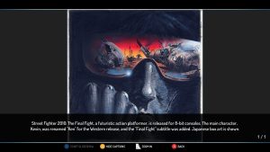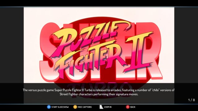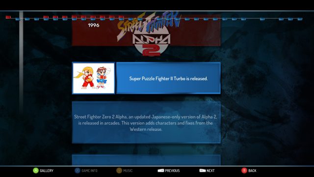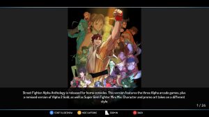 Each title is accompanied by a history of the game, detailing the original release date, hardware, trivia, and even secret codes to unlock extra characters or features. A Museum mode contains galleries full of original sketches and concept art, an interactive timeline, bios for all of the game’s characters, and a jukebox where you can play back all of the game soundtracks. The interface is simple but gets the job done, and load times for the games and features are nearly instantaneous. It’s easy to jump from game to game, making exploration pretty effortless. The pause menu is available at any time, letting you switch games or characters, pull up nicely formatted special move info, or change your display options.