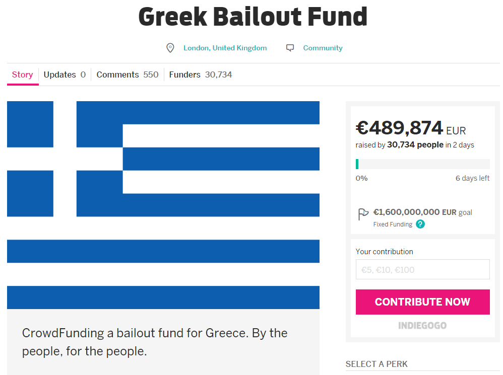 At one point during the day, the campaign page overloaded Indiegogo’s servers. “The Greek Bailout Fund campaign page is experiencing some issues due to its astonishing popularity,” the site wrote. “It should be back up shortly.”