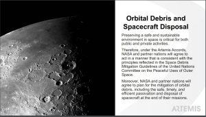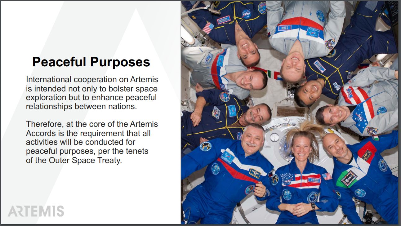Bridenstine said the accords are based on the Outer Space Treaty, which forms the basis of international space law, and said the goal is to establish a framework by which the agreements can be enforced. That is, if nations want to participate in a NASA-led program of human exploration into deep space they have to agree to do things like mitigate orbital debris.