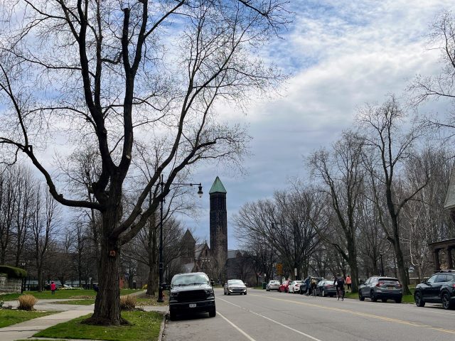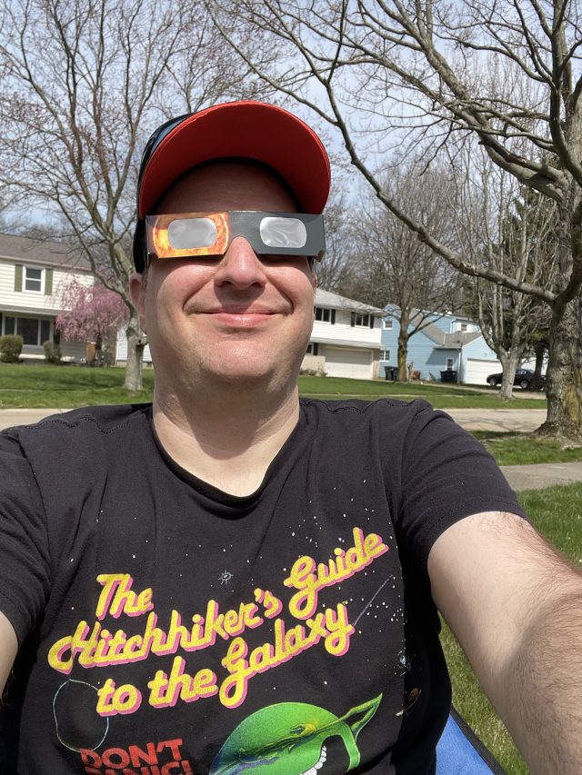 The day started cloudy, as is typical in early April here. With one hour to go, I chatted with Donald Blank. He was filming an eclipse time-lapse as part of a larger documentary on Buffalo: its incredible history, dire poverty, heroes, mistakes, everything. The shot he wanted had the First Presbyterian Church, with its grand spire and Tiffany windows, in the frame. A 200-year-old stone church adds a certain context to a solar event many of us humans will never see again.